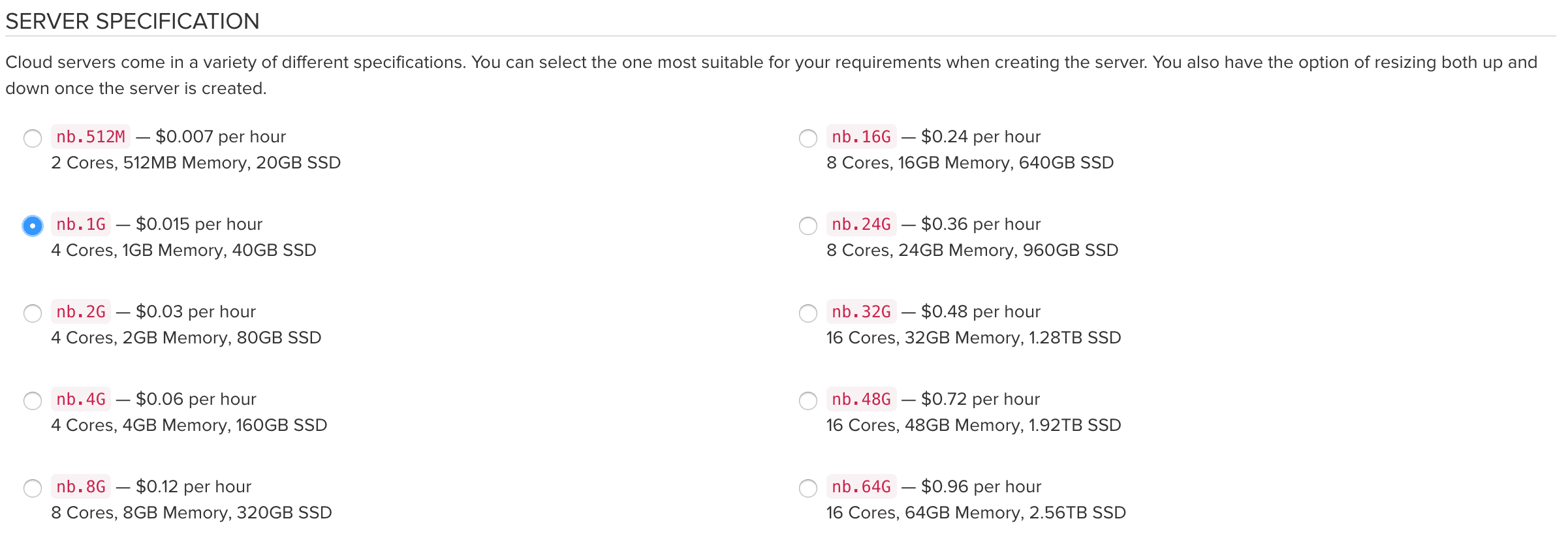The next step is to select the specifications of the server that you need to launch. It is usually recommended to go with a nb.1G server at least, as running a MySQL database on a server with 512MB of memory only tends to cause problems.